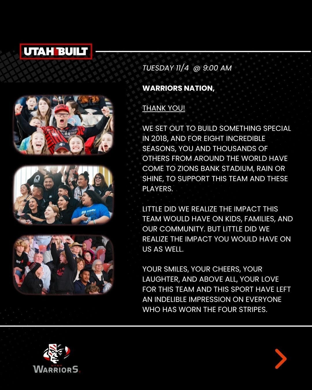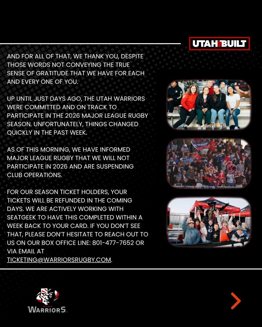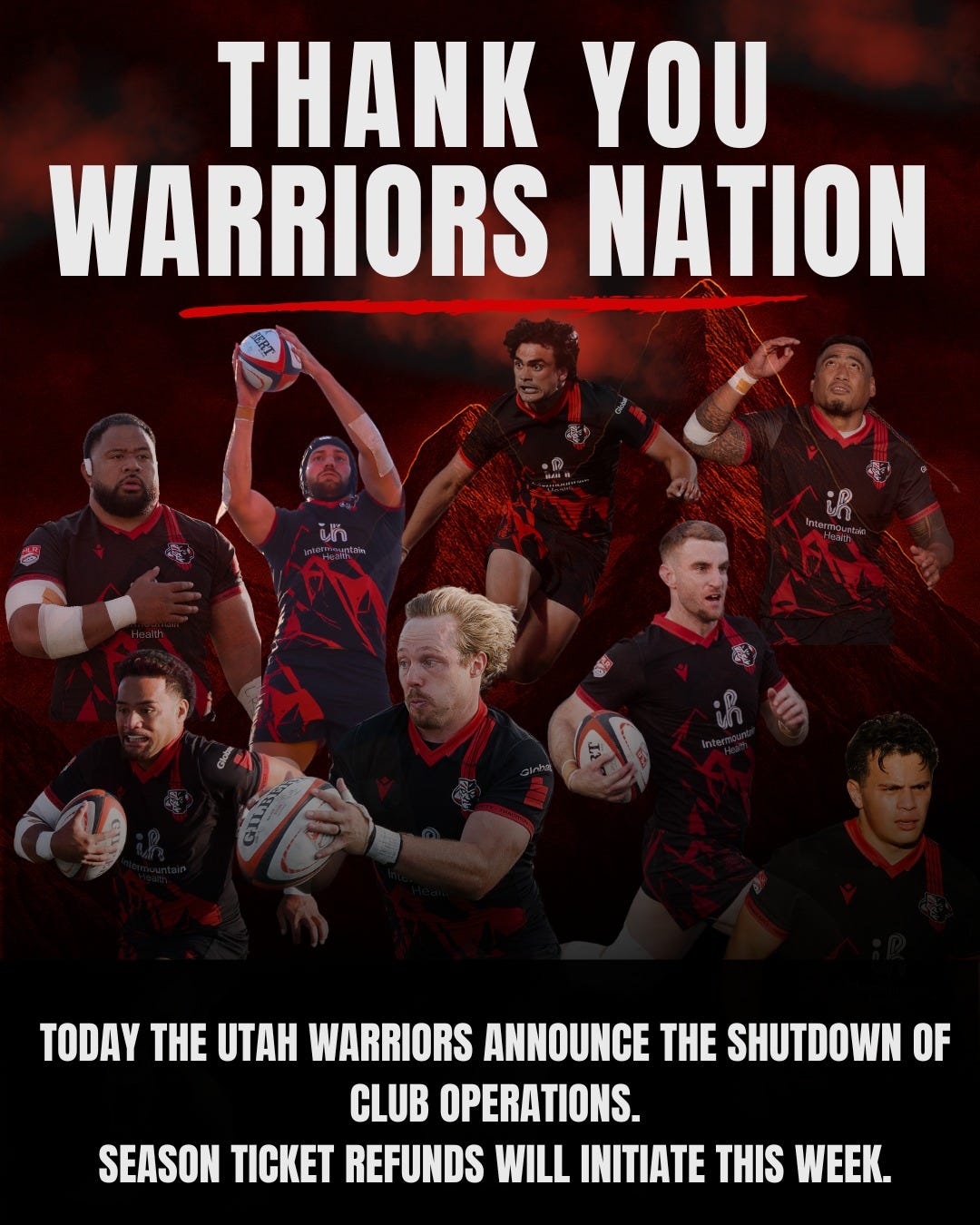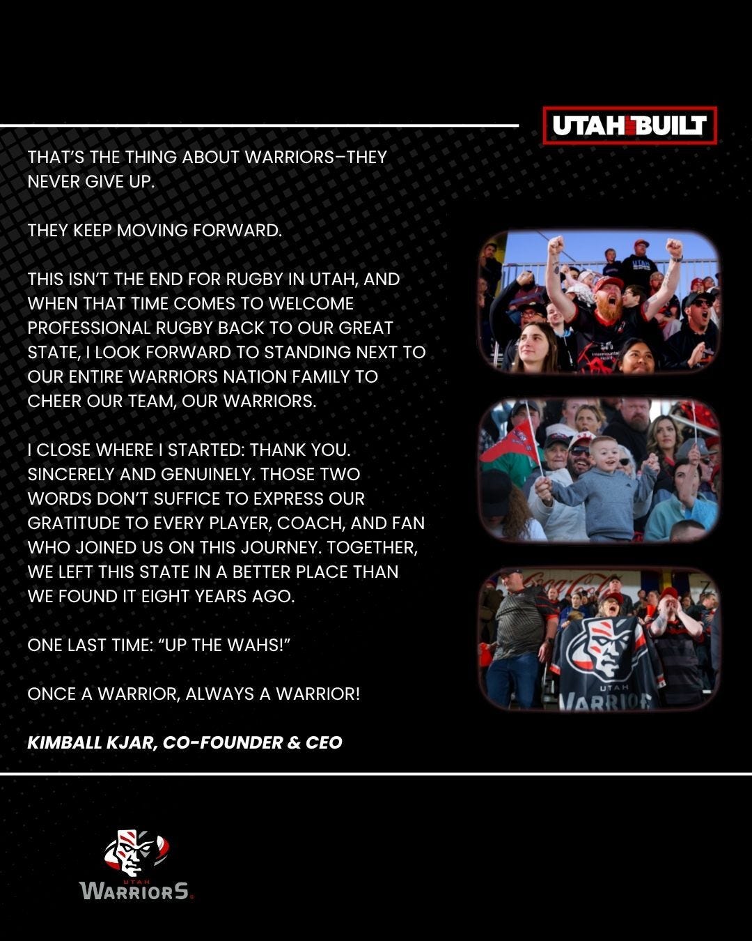 This isn’t the end of rugby in Utah, and when that time comes to welcome professional rugby back to our great state, I look forward to standing next to our entire Warriors Nation family to cheer our team, our warriors.